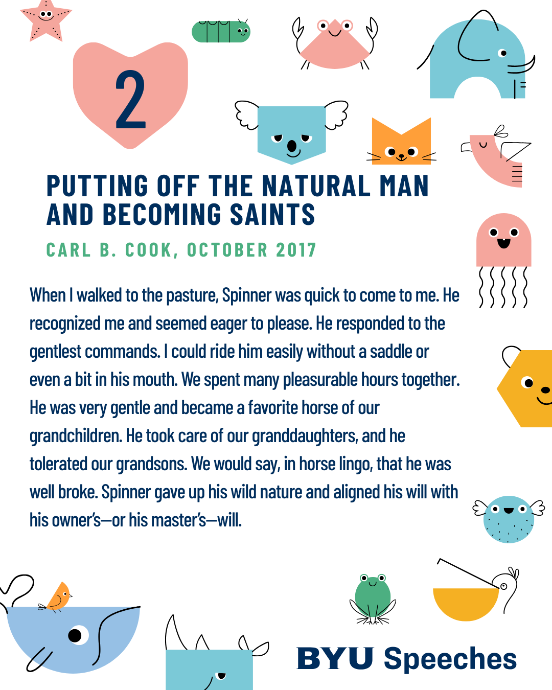 Animals have a way of bringing joy into everyday life and reminding us of simple truths about love, patience, and gratitude. We are happy to share these BYU devotionals that include memorable stories and moments with animals. If you’re someone who smiles at a wagging tail or a bird outside your window, these speeches are for you.