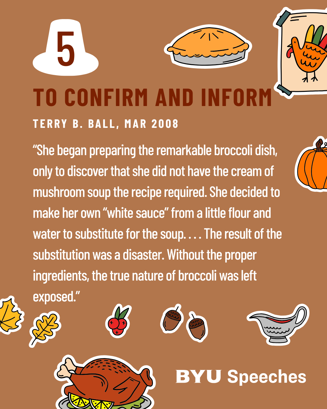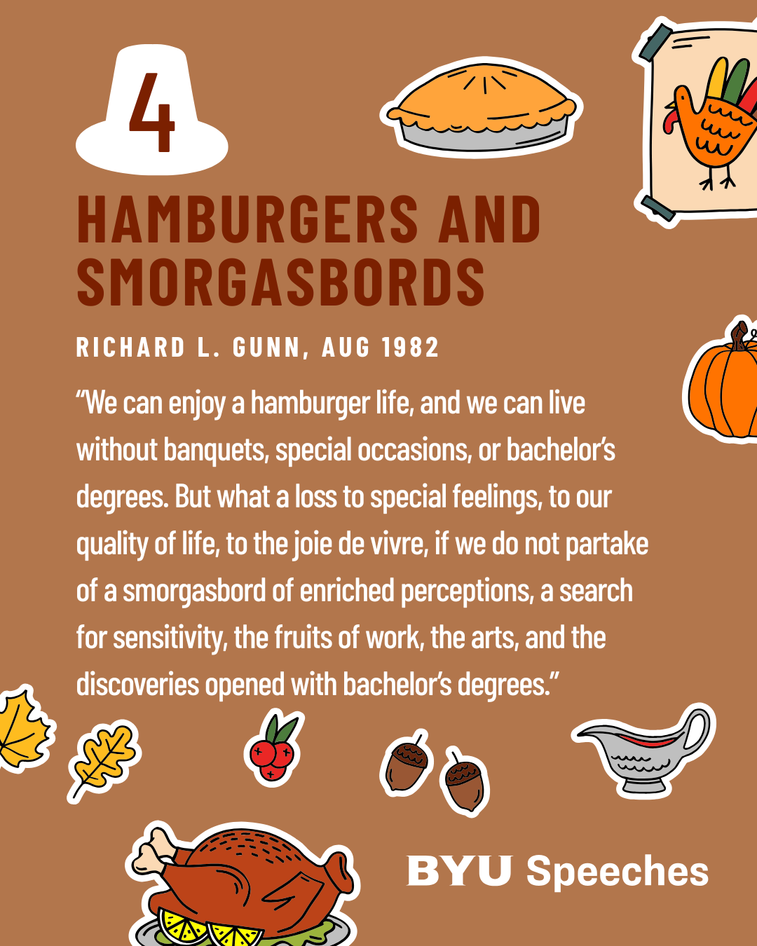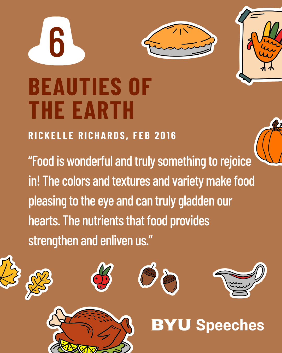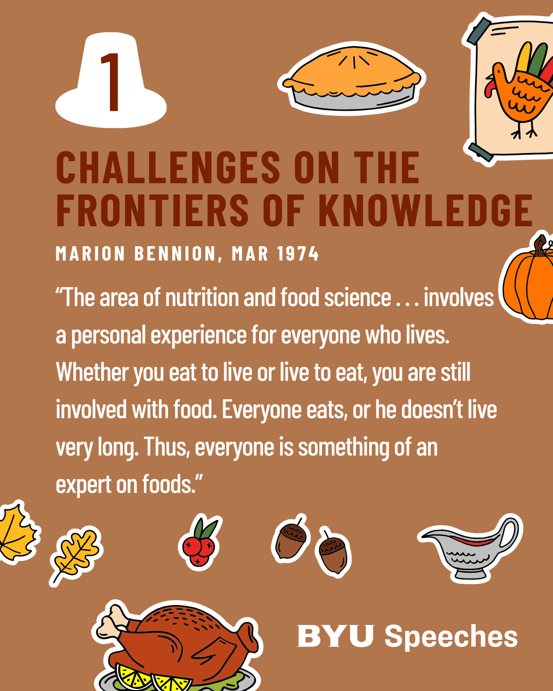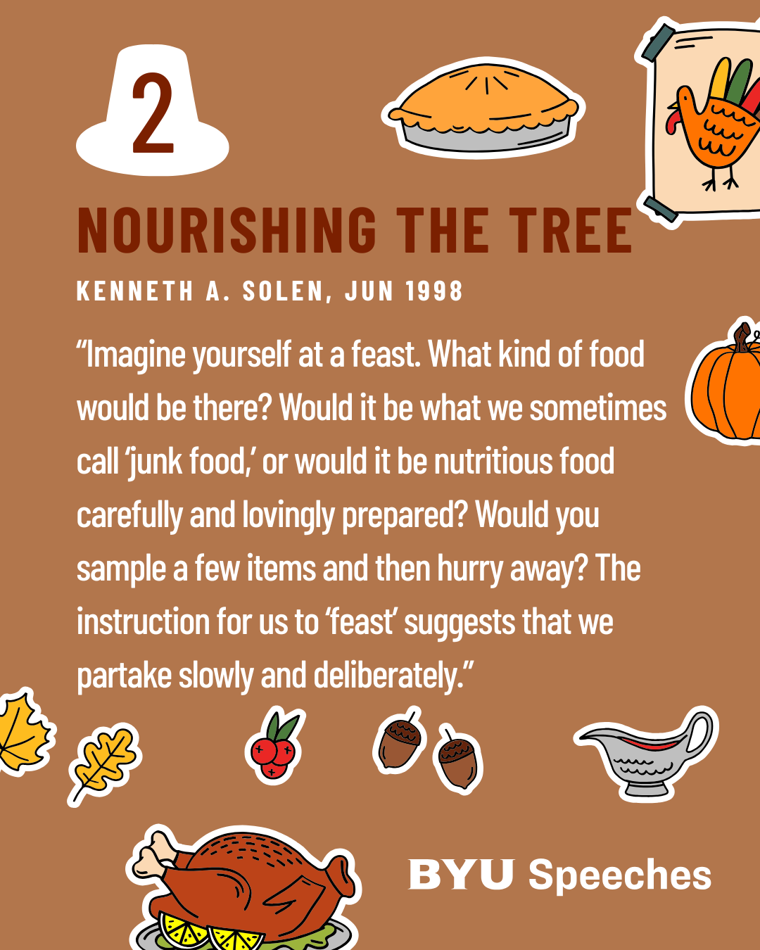 Food is essential for our bodies—but our spirits must be fed as well. While we can’t hand you a slice of pie through the screen, we can offer these spiritually filling BYU speeches that just happen to talk about delicious food. Whether you’re counting down to your lunch break or craving something more than a snack, we know you’ll enjoy these scrumptious speeches.
