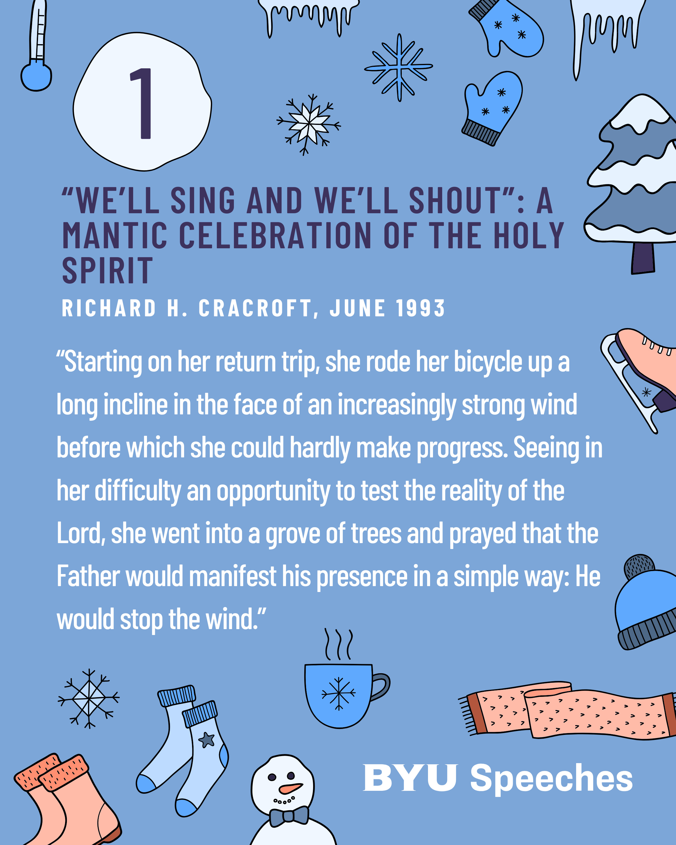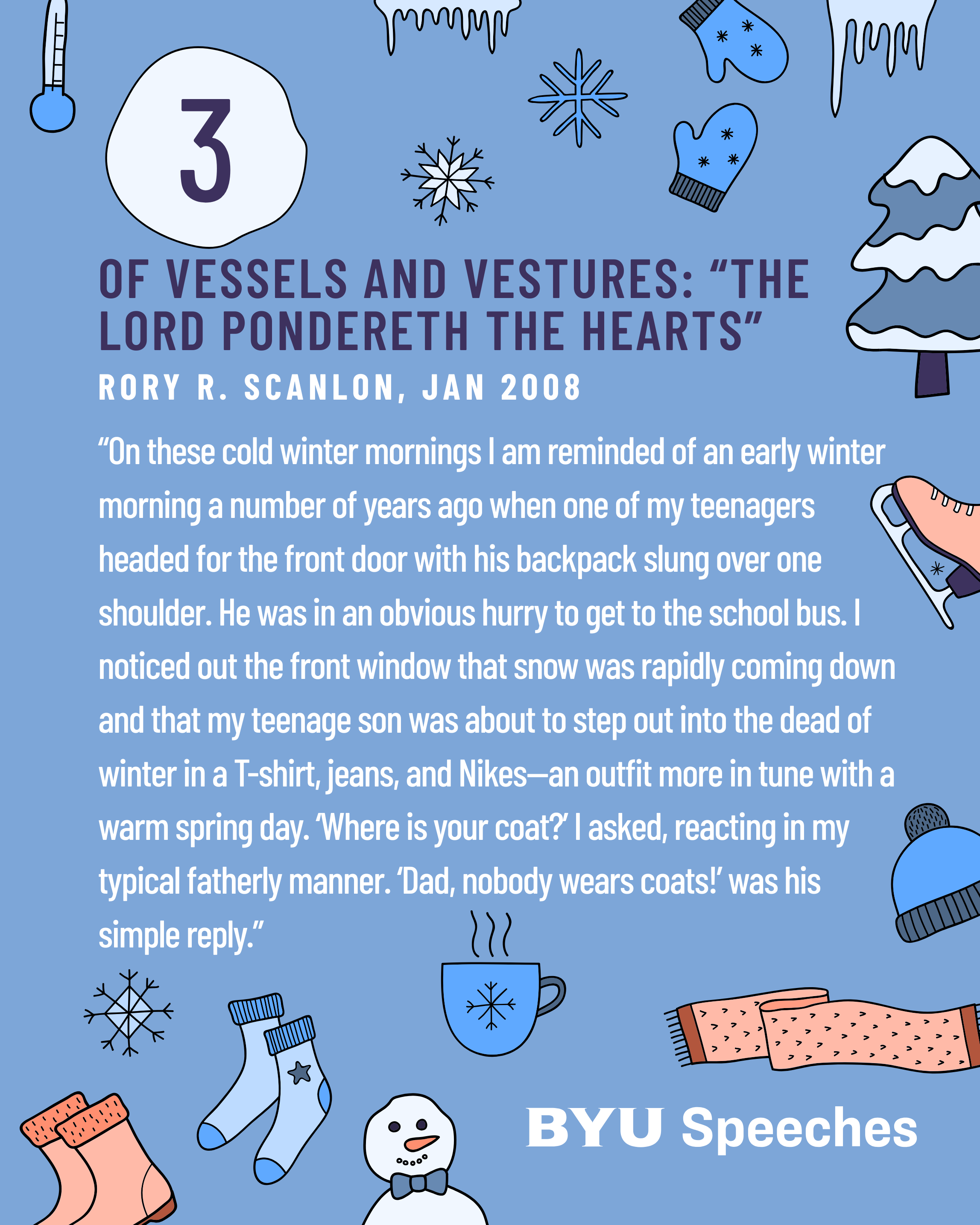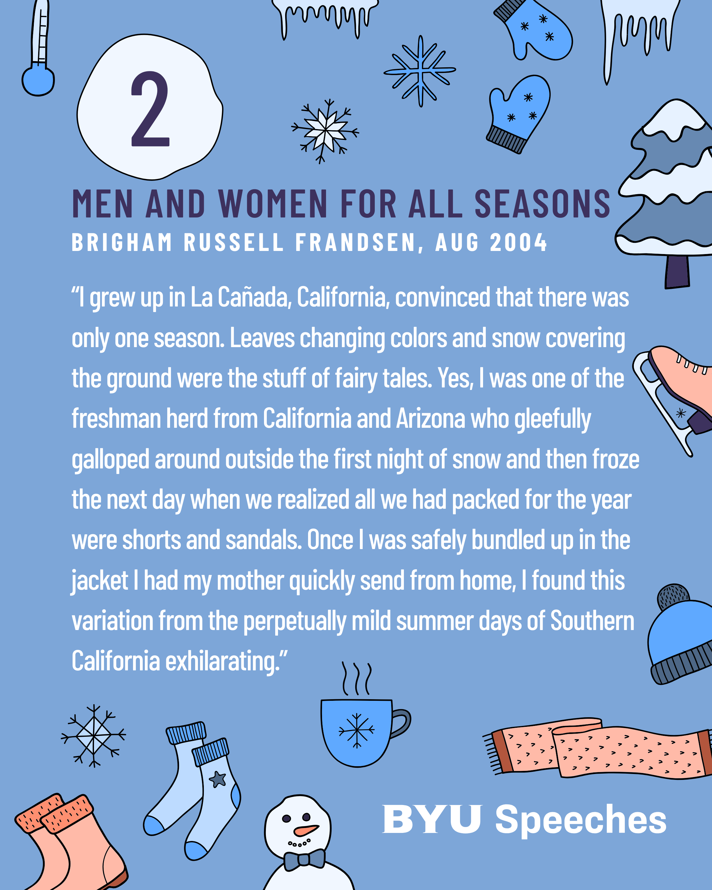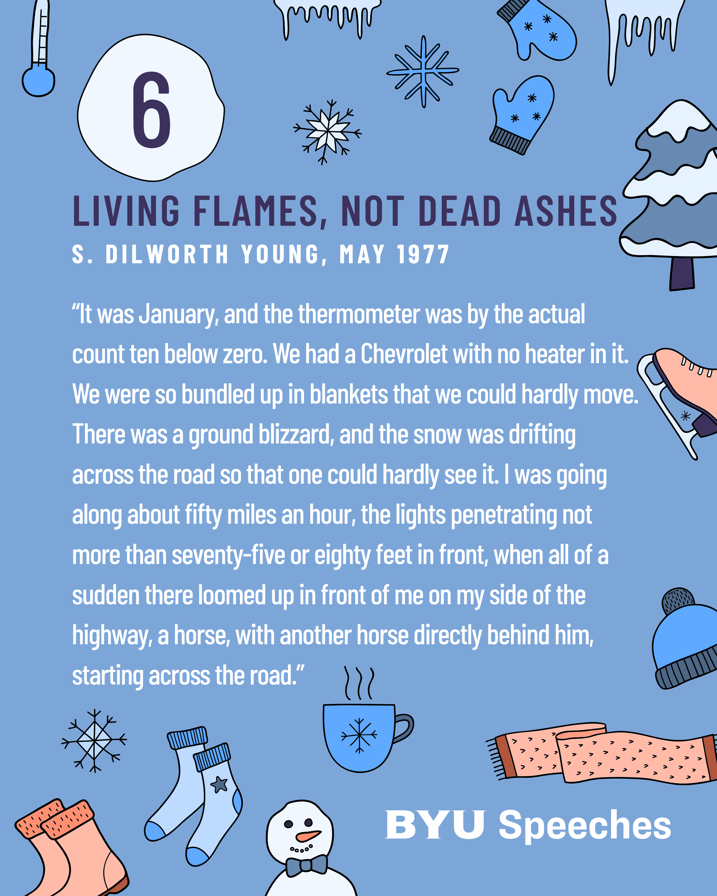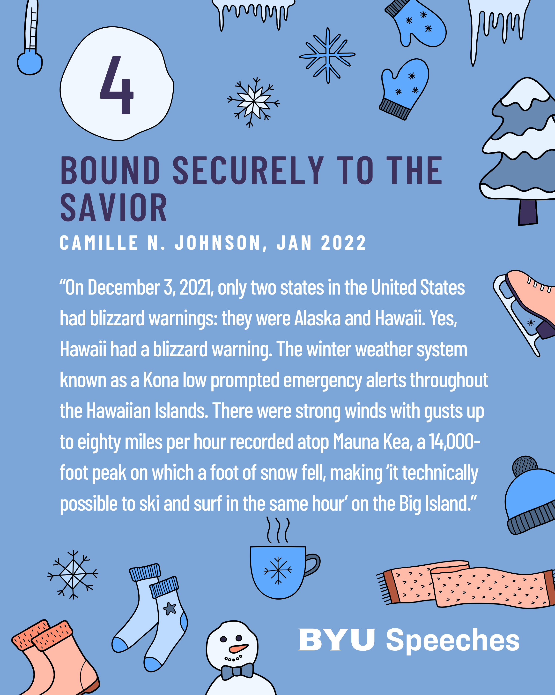 Winter weather isn’t just cold—it’s full of cool metaphors that many speakers use to warm our hearts. These seasonal BYU Speeches teach about endurance, hope, and the surprising ways the Savior helps us weather all storms. From icy roads to spiritual slowdowns, these talks invite us to find the warmth of gospel truth thawing even the deepest freeze.