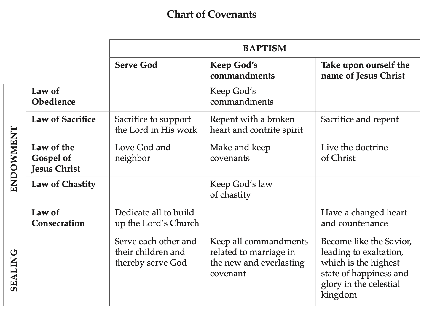 First, we covenant in the endowment to “live the law of obedience,” which means that we “strive to keep Heavenly Father’s commandments.”15 This covenant aligns squarely under the baptismal covenant promise to keep God’s commandments.