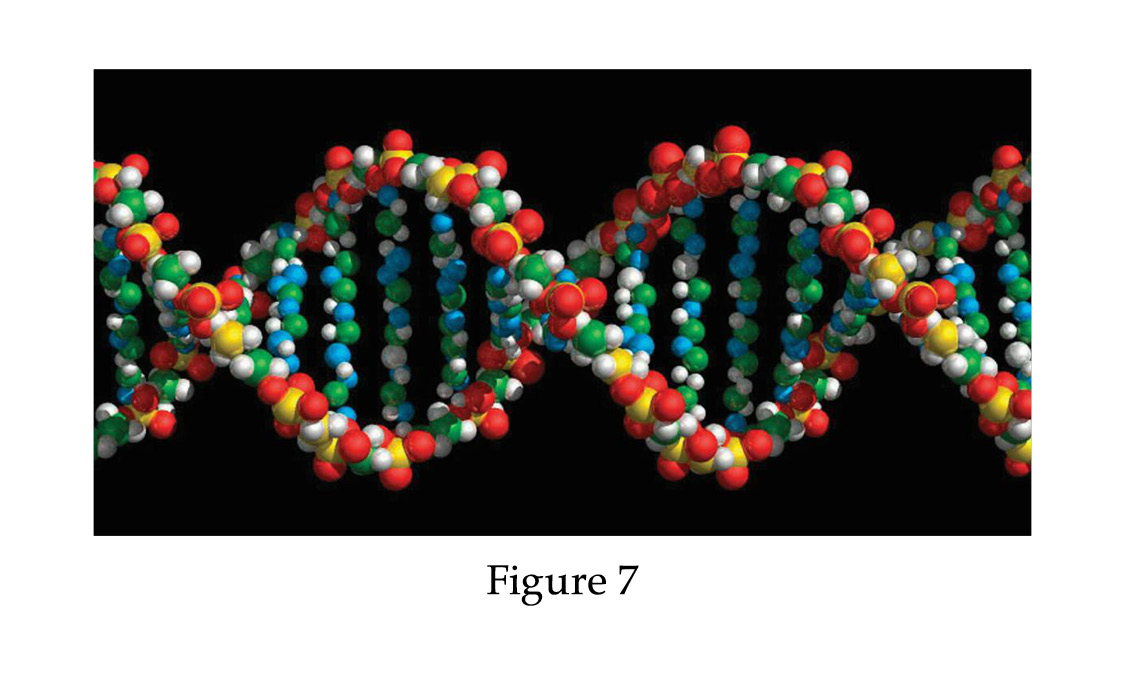 At the other end of the spectrum of size we also see divine design in the tiny but significant DNA molecule. This molecule (figure 7), which performs so many large chores, is formed by a double, intertwined helix.
